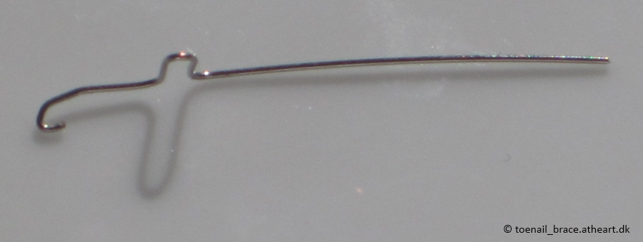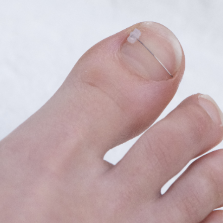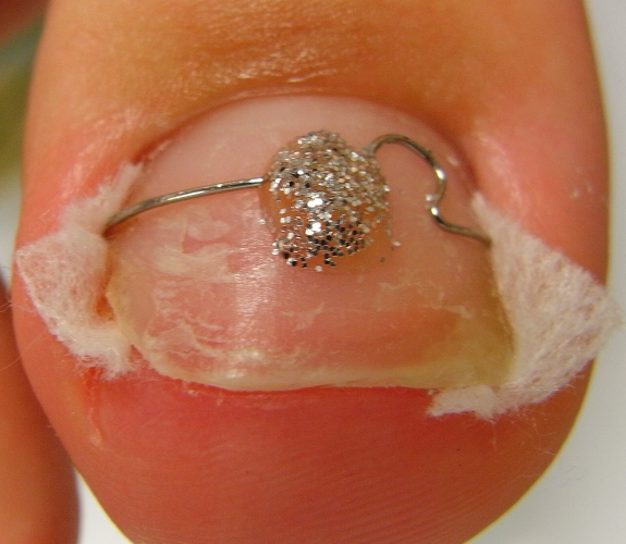 The foot therapist will divide the main part into two, and make a small hook at the end of each to be fitted under the nail edge.