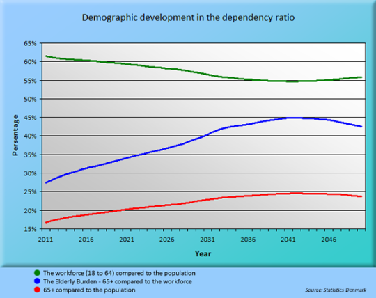 Even though Denmark manages to keep the cost of the health care system at 11.5% of the GDP , we are still among the top 5 spenders in the OECD. And at the same time we face the same demographic development in the dependency ratio as in many other countries - or as we’ve ever so charmingly named it “The Elderly Burden”. The number of people over 64 years is growing faster than the number of people in employment (18 to 64 years).